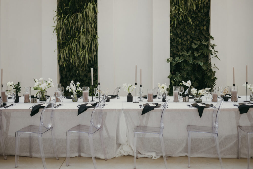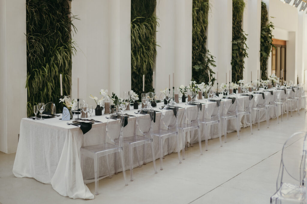 Our pièce de résistance, the Conservatory is an architectural marvel inspired by the beauty and function of greenhouses. This airy space is flooded with natural diffused light from the translucent southern roof, while the solid northern roof offers protection from the summer sun. Vertical gardens and hanging plants breathe life into the space, complemented by custom designed wooden tables and ghost chairs. At night, the soft glow of 90 low-hanging lightbulbs sets a romantic tone for an unforgettable celebration.